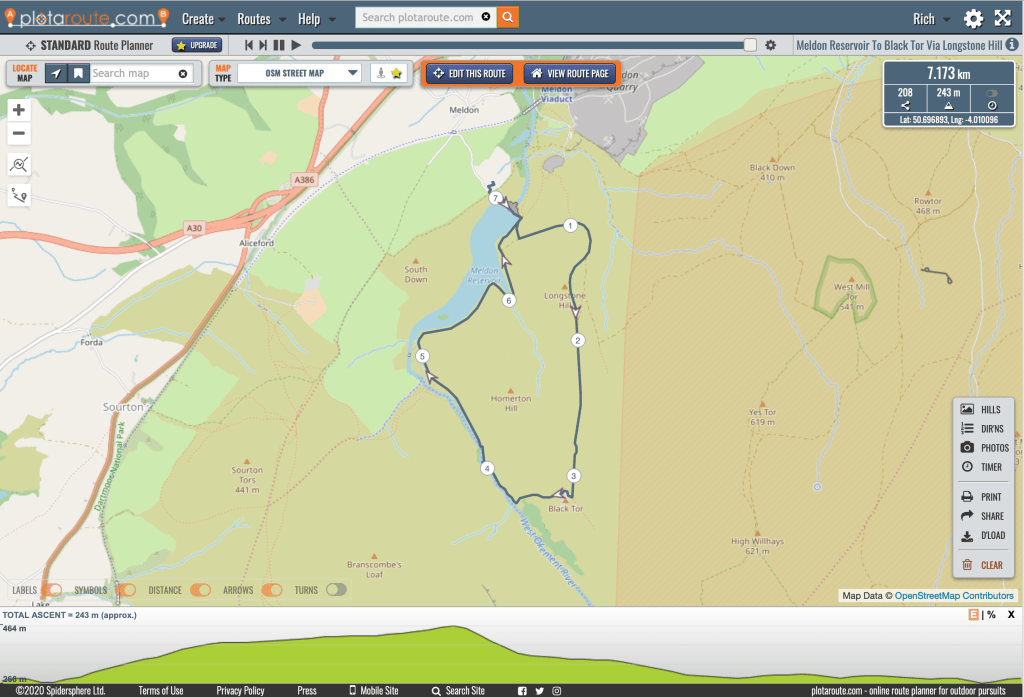 Route map for Meldon Reservoir To Black Tor Via Longstone Hill by Rich on plotaroute.com
