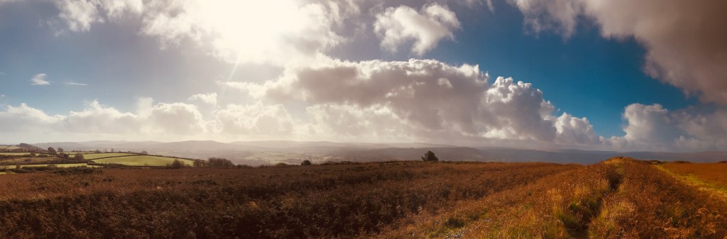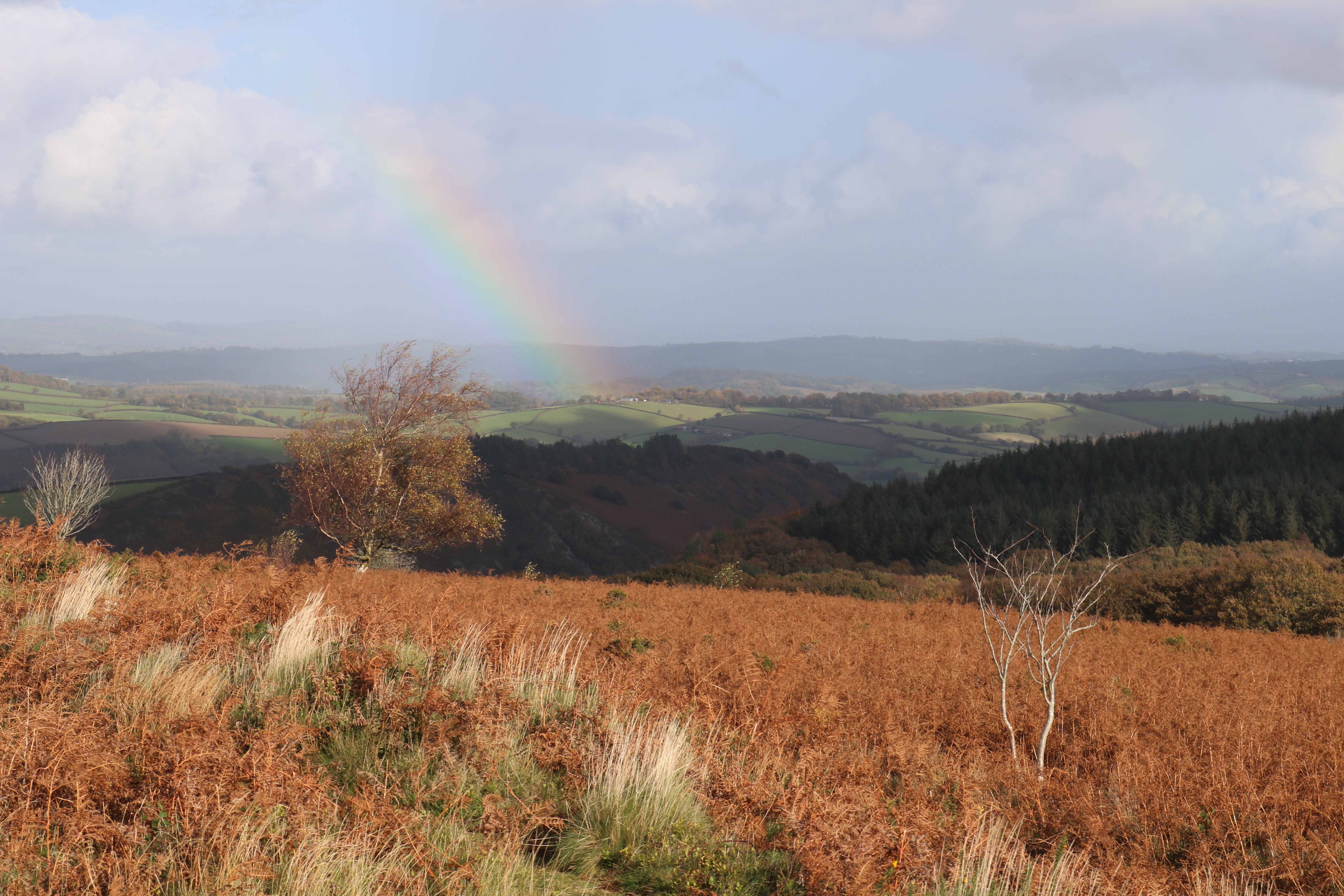 Passing rainbows alerted us to the chance of rain, and it wasn’t long before a big one headed towards us from Chagford. We scooped up our things and headed back down the hill much more quickly than we ascended it. Somehow we avoided the rain, and with time to spare we sneaked in a swift pint by the riverside at the Fingle Bridge Inn.