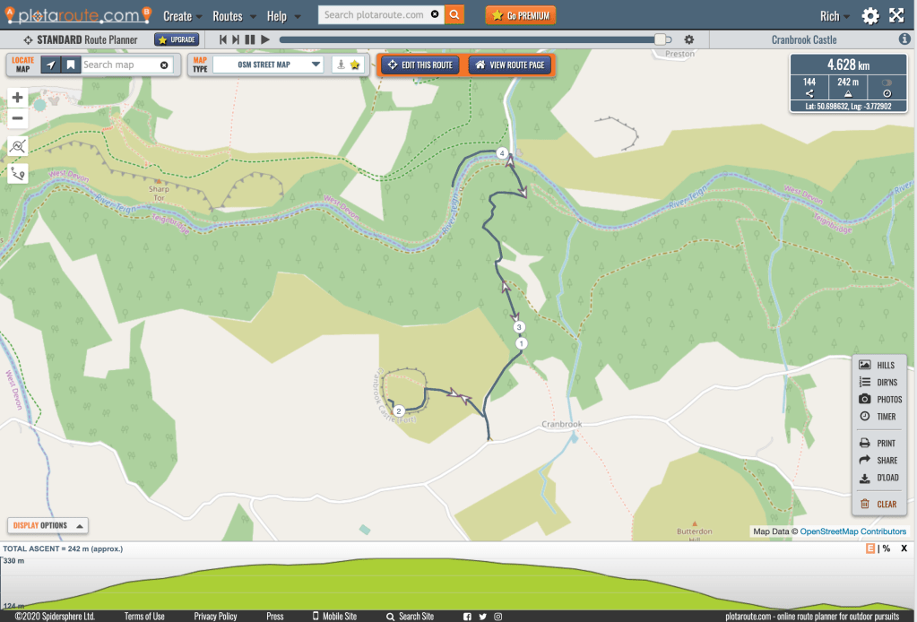 There are four castles overlooking this stretch of the Teign, although of these only Castle Drogo is instantly recognisable as one. The other three are Iron Age hillforts. Prestonbury Castle is at the top of the steep-sided slopes immediately behind the Fingle Bridge Inn, and sadly the landowner does not allow public access. Further east, Wooston Castle lies deep in the woods and has recently been excavated – if you’re interested in hillforts, check out the Fingle Woods blog which is full of fascinating info about the dig. Our target was Cranbrook Castle, a contour fort at the top of the hill facing Prestonbury across the river.
