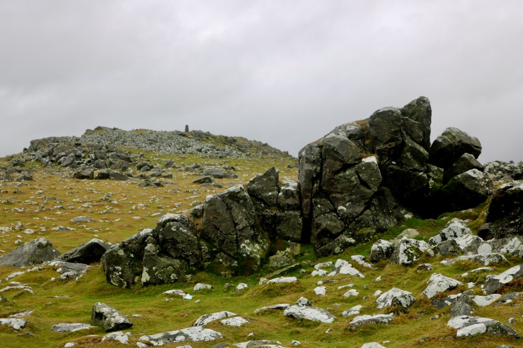 The gloom, wind and rain were a shock to the system but it soon passed, and hand-in-hand we made our way up the hill. It doesn’t take long to reach the rocks you can see from the car park, although it’s fairly steep and the actual summit is a few hundred metres further on. On the way you pass a line of earthworks marked on the map as ‘Boundary Work’ in that endearing font used to mark antiquity sites. If you like rocks, there’s plenty of interesting stuff here.