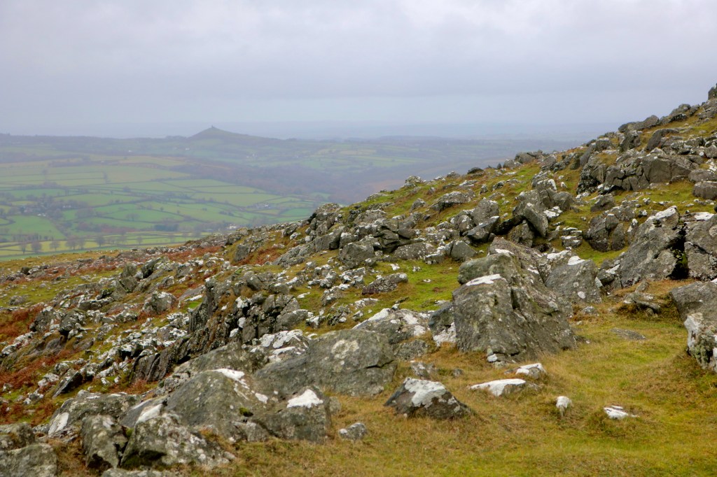 First, the rocks themselves. The higher you go, the terrain becomes less and less like Dartmoor. The rocks are fractured like they are on most tors, but here they are somehow more angular and less rounded, darker and covered with large patches of white-red lichen. There’s a good reason for this – the rocks aren’t granite like the rest of the moor! Cox Tor is right on the western edge of Dartmoor and is actually composed of slates and microgabbros that were heated and pressurised when the Dartmoor granite moved in next door. They were ‘metamorphosed’ into hornfelised rocks that are hard and crystalline but definitely not granite.