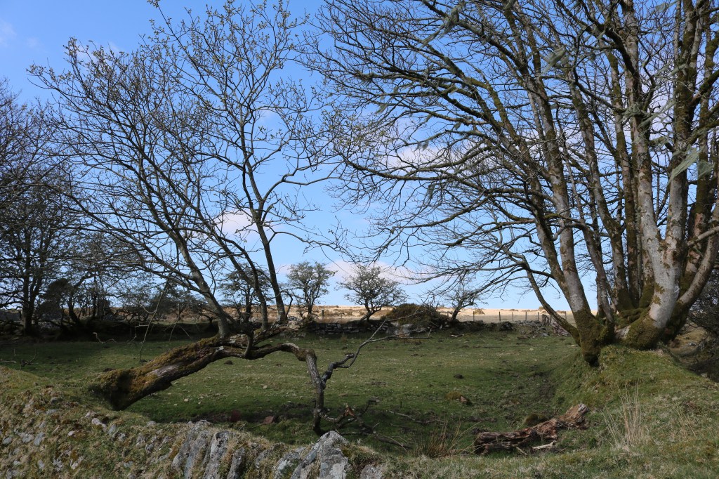 We passed the disused Gobbett tin mine and carried on down into the valley. Stacks of felled trees lined either side of the road, some a couple of metres in diameter. Sherberton Farm is run by Anton Coaker, a well-known local farmer who runs a sawmill operation and reclaims granite from civil engineering projects and the like as well as farming beef herds. The Coakers have been farming in this area for generations. We were noisily welcomed to the farm by a collie and another smaller dog, passed through the yard and over the top of the hill beyond.
