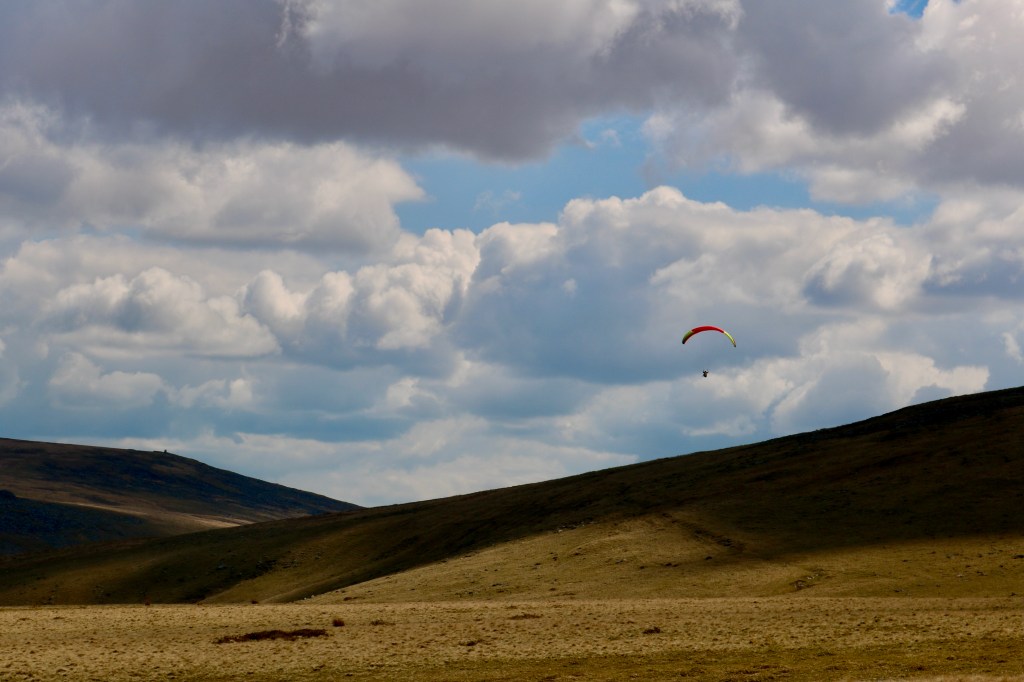 While we explored, a paraglider was preparing to run off the top of Branscombe’s Loaf, and we stopped to watch as they ran into the wind to launch. They appeared to be unable to gain much height, probably due to the gentleness of the breeze, and gently drifted down to land a few hundred metres away from us. Three children had been watching from the top of Sourton Tor and ran excitedly past us on their way to greet their relative who had perhaps just made their first solo flight.