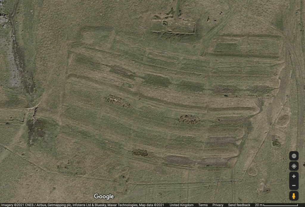 Coming this way, or if you’re starting at the parking area near Prewley Farm, you pass a fairly impressive and substantial set of ridges and ditches (OS grid ref SX 546900). Clearly earthworks rather than a natural feature, they look very much like a set of Iron Age ramparts, though too shallow and numerous. They are actually the remains of Sourton Ice Farm, and are best appreciated from the air: