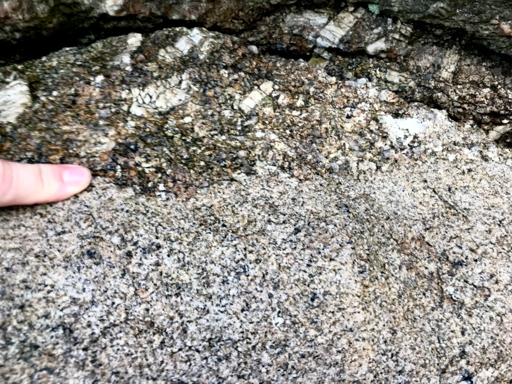 In fact, it forms the upper edge of the magma chamber that the finer-grained granite would have occupied. There is a very clear and sharp edge, although it can be seen in places that the older rock has been meted into the younger rock. The magma chamber would have cooled and solidified relatively quickly, which is why the crystals in this section are smaller.