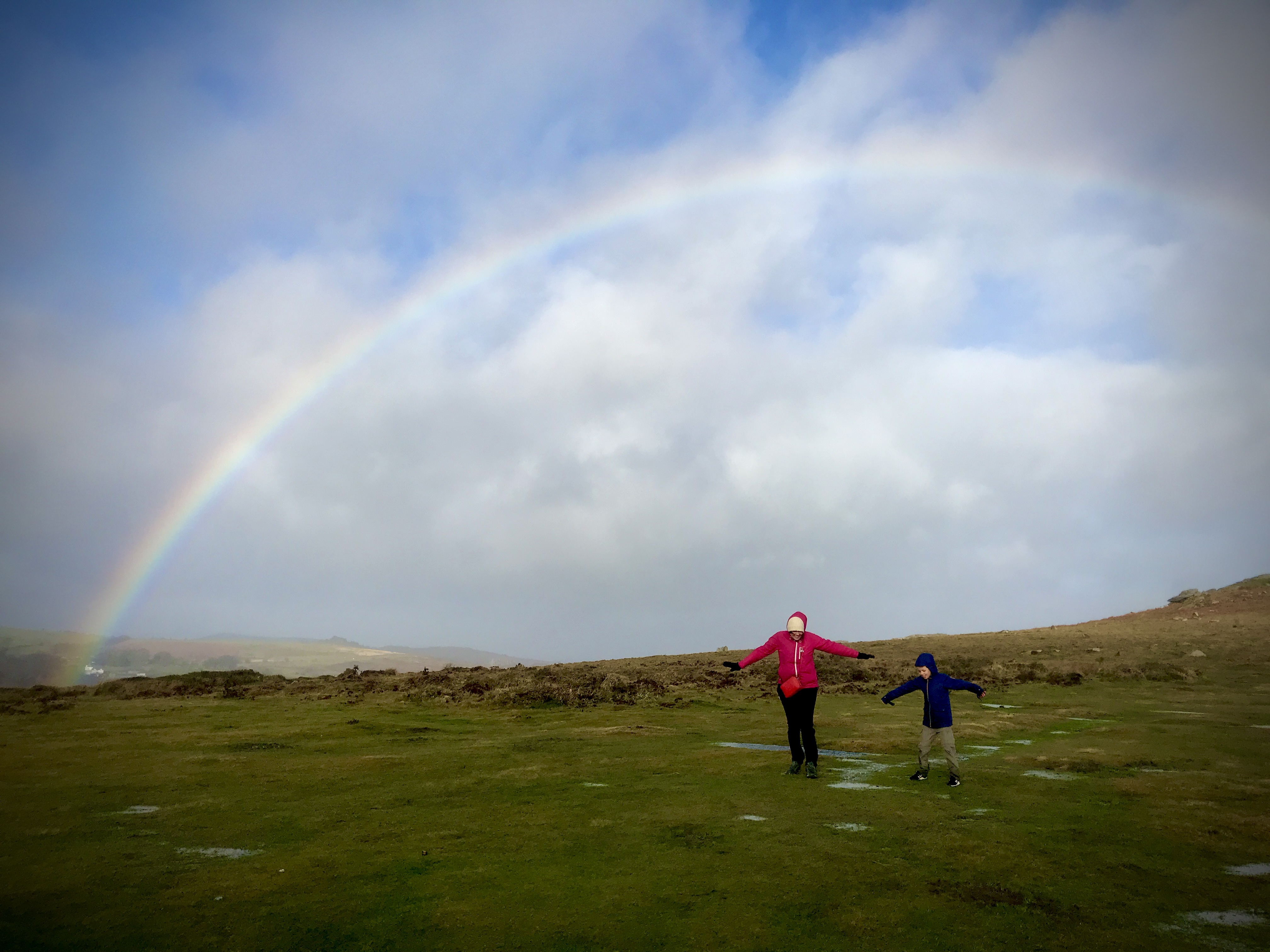 Saddle Tor is only 300m from the car park on the western side and 40m above it (you can halve these numbers if you park to the east). The difference in the wind was remarkable. At the top, it was difficult to walk and in the stronger gusts I struggled to stand still. We lingered long enough to let the boys experience it and to take a couple of very shouty videos expressing our astonishment at the windiness of it all, then headed off the top itself and contoured round the lower slopes of the tor towards the car. We were occasionally plunged into near darkness when thick clouds came over and would then be suddenly shrinking back from the brightness of the sunshine when it broke through. It felt incredibly dramatic and bright, colourful rainbows brought an extra sense of awe. It was a quite wonderful day to be out.