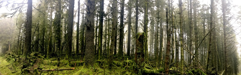 Towards the top of the hill, we started to climb into some low cloud, which gave the forest a spooky, ethereal atmosphere. There was little birdsong and the colours were dominated by a rich velvety green, with shades of black and white and grey interspersed. It was still, eerie and quite beautiful.