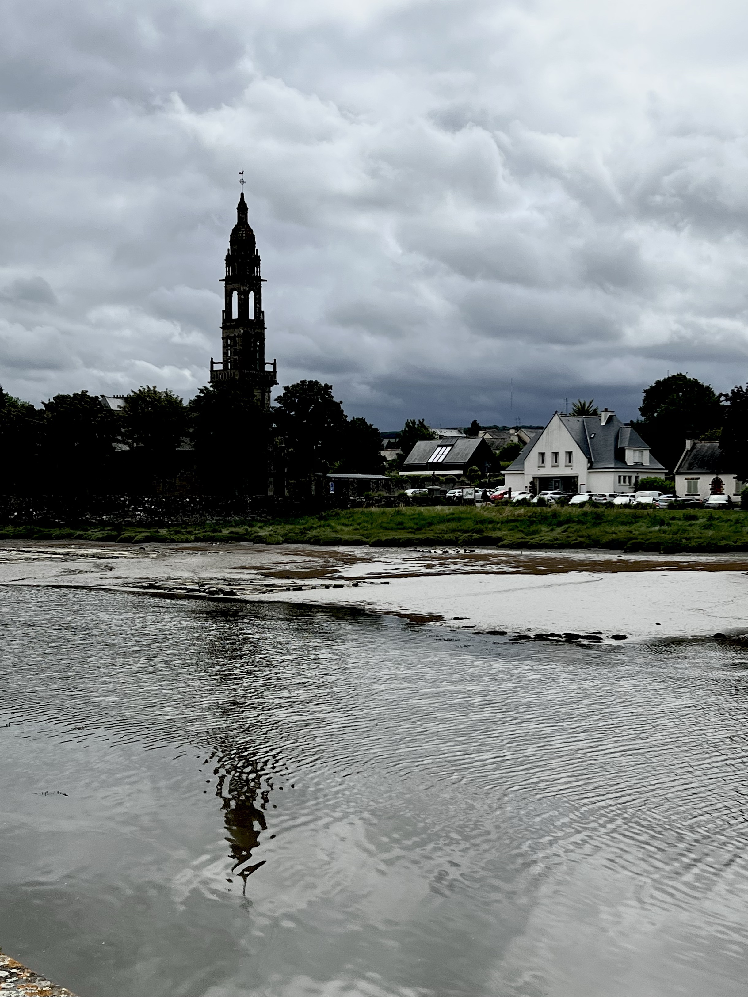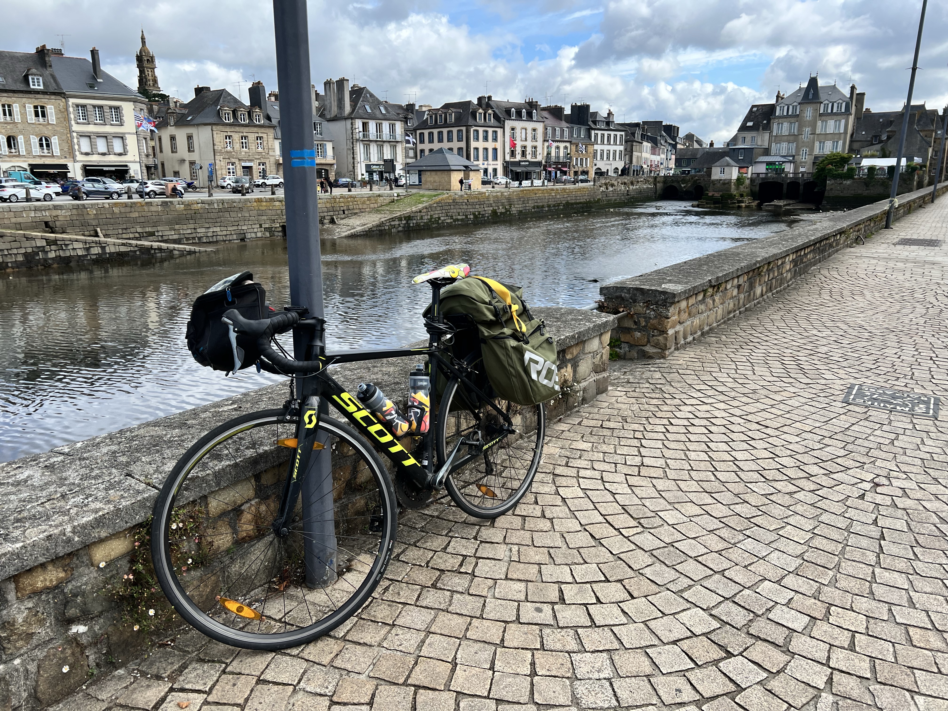 Still, with a hotel booked over 100km away, there wasn’t much I could do but get on with it. To be honest, the first 20 km or so were fairly non-descript, on busy stretches of road through unremarkable countryside and the skies not being able to quite decide whether to rain or not. Things got a bit more interesting when I passed the Château de Kerjean and then found myself being serenaded by fighter jets from the nearby Air Force base. I was making really good time and I was soon enjoying the climb up to La Roche Maurice, which Graeme and I visited a couple of years ago. None of the cafés around the little square had their tables and chairs out, so I pushed on and instead sat in the sun a bit further on in the medieval town of Landerneau. All was well with the world; I was making excellent time, my legs felt good and even the weather seemed to be improving. At last, at Le Faou, I found some cafes with tables outside, and sat in the sun for a well-earned first beer of the trip.