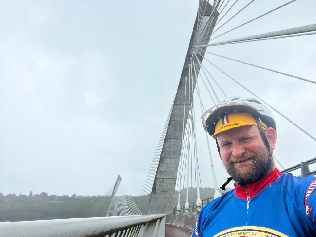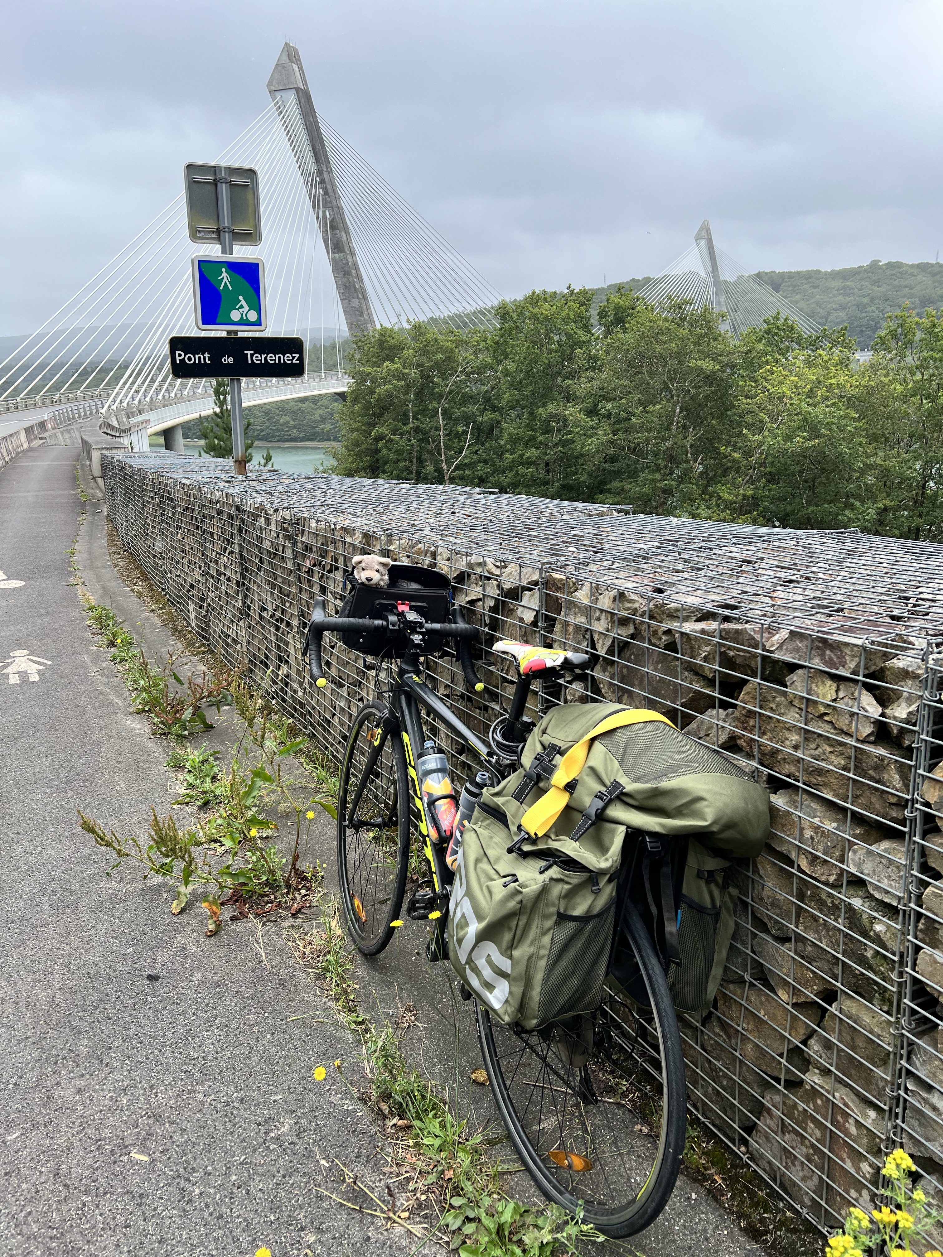 A few miles on I was approaching the Pont de Terenez, which is the bridge that connects the Crozon Peninsula to the rest of Brittany. There had been a couple of little patches of drizzle on the way but nothing major. I stopped to take a couple of photos of the bridge and as I did it started to properly come down. Not just drizzle but proper big lumps of stinging rain, rain that feels like it’s out to get you. I scurried over the bridge and started to climb up through the woods on the other side, but it didn’t relent. It had hit me at the worst possible point, on a stretch of road where the were no towns or villages or even isolated cafes to take shelter in. It was just me and the bike and the bloody weather. Eventually I found a little local cider producer who had a bar, so I hid away in there for a little while. But outside the weather didn’t improve, and I was shivering as soon as I got outside again.