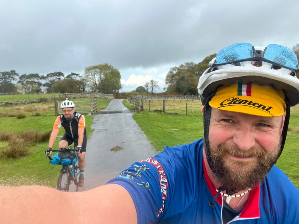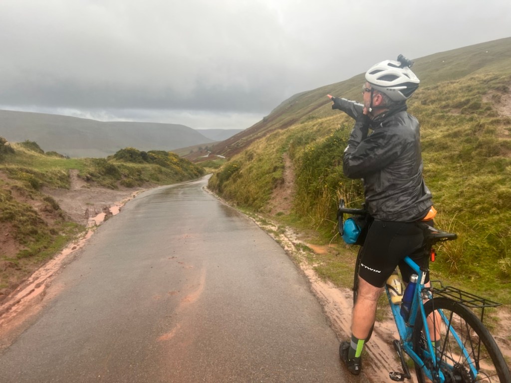 We then had a nice rolling section along part of NCR 8, through Felindre and Tregoyd, still in early autumn sunshine. We turned right and started our big climb of the day, steady at first and then a sudden wall at Cocket Wood where we had to do the unthinkable and jump off and push for a couple of minutes. It was so steep I could barely walk up in my cycling shoes, and a sudden rain shower apparently out of nowhere made the surface greasy. Back on, we carried on up the lanes, climbing slowly, a patch of drizzle filling the gap between Twmpa and Hay Bluff ahead. This pass, Gospel Pass, was our target: a well-known local climb and the gateway to the lovely Vale of Ewyas beyond. We came out onto a flattish patch of open ground and there it was, shrouded in fog above us. Big drops of rain blew across us from the right and it seemed the weather forecast no longer applied. We were in for a proper Welsh welcome.