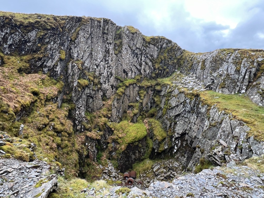 The second time we pulled up the car park was empty, and we started our walk along what I suspect was the old packhorse route, contouring round the hill to the south-east to a spur before turning west up to the quarries. This was still a tough route but hopefully not as hard on the knees at the direct route. The path was at first bisected by a fence and was then obscured by rockfalls and landslips. We were immediately into security on steep ground – great mountain leader practice! The route felt a little exposed but not dangerously so, but with the family tackling this kind of terrain for the first time I worked hard to make sure everyone was safe and secure. I resisted the urge to get the new rope out of the bag. The going was of course slow, and after half an hour we were only a few hundred metres from the car. Up ahead a line of reeds marked some flat ground where the path re-emerged from the rubble, and once we got to this the walking got easier.