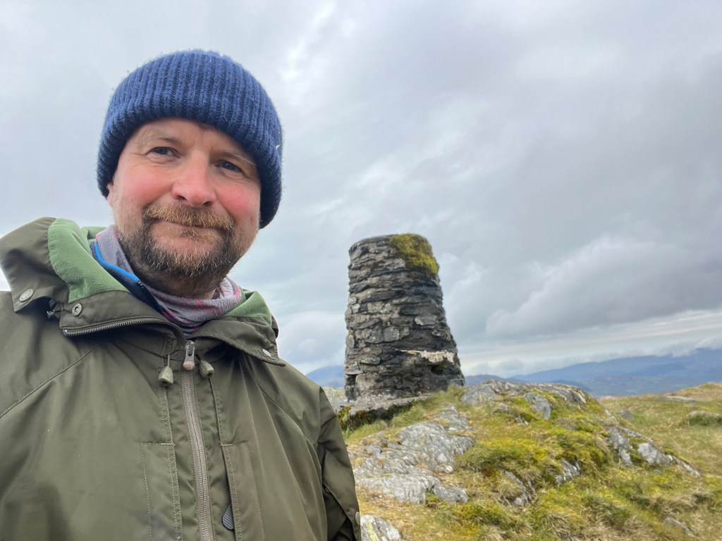 Everyone was fit and well and I was keen for us to push on. Two kilometres to our south-west was the summit of Waun-oer and I felt we had the time and energy to get there. We started off with a contouring route through some wet ground, avoiding a small summit midway, then dropped down into a small col. We had a brief discussion about whether to go on. The hillside ahead was grassy and extremely steep, and was still wet from the earlier rain. And were we pushing Freddie’s knee too much? In the end he took the decision for us to give it a go, and we zig-zagged our way gingerly towards the summit. It was one of those horrible-shaped hills that seems to go on forever, and the summit only appeared in the last few metres, but eventually it popped into view and the boys raced to be first to it. It was a small but not insignificant peak. At 670m we were higher than any point on Dartmoor, and we loomed over most of the nearby hills. To the west we could see Cadair Idris, its summit still shrouded in cloud, and the Irish Sea as a faint line beyond.
