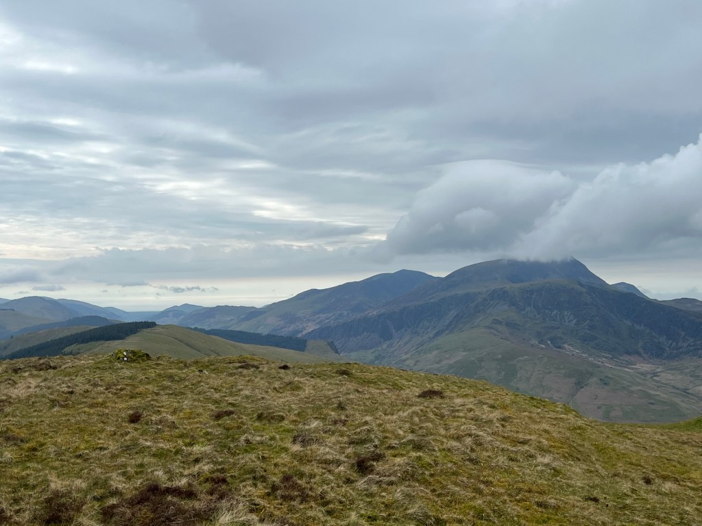 Rounding the spur put us into the fold of the hills, and our delayed start had given the cloud a chance to rise. The tops were now in view and Cribin Fawr was streaked dark, as if chocolate had been poured over its flat summit and started to run down its sides. Legs were getting tired the higher we got, but everyone did well to focus on the summit and we were surprised to find there was little wind at the top. We sat in the open and enjoyed our lunch with a good view.