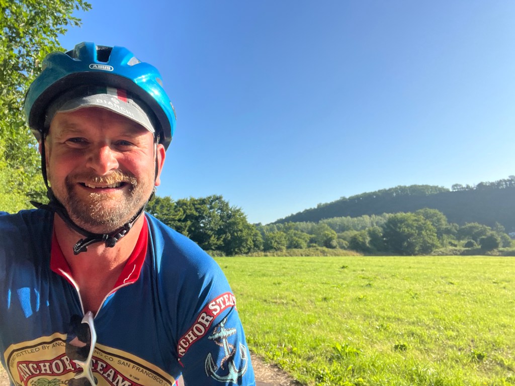 After Caen, the Orne valley continues and becomes more scenic as you move into the region known as the Suisse Normande. Calling it alpine would require some mental gymnastics, but there were trees, rocks and a river, and it was all very bucolic and relaxing. I was making good time and feeling fantastic. I texted a good morning to the family, sent a voice note to my mum and took an improbable number of selfies while cruising along the flat, straight tarmac. It was warm, the sky was blue and my late night was a distant memory.
