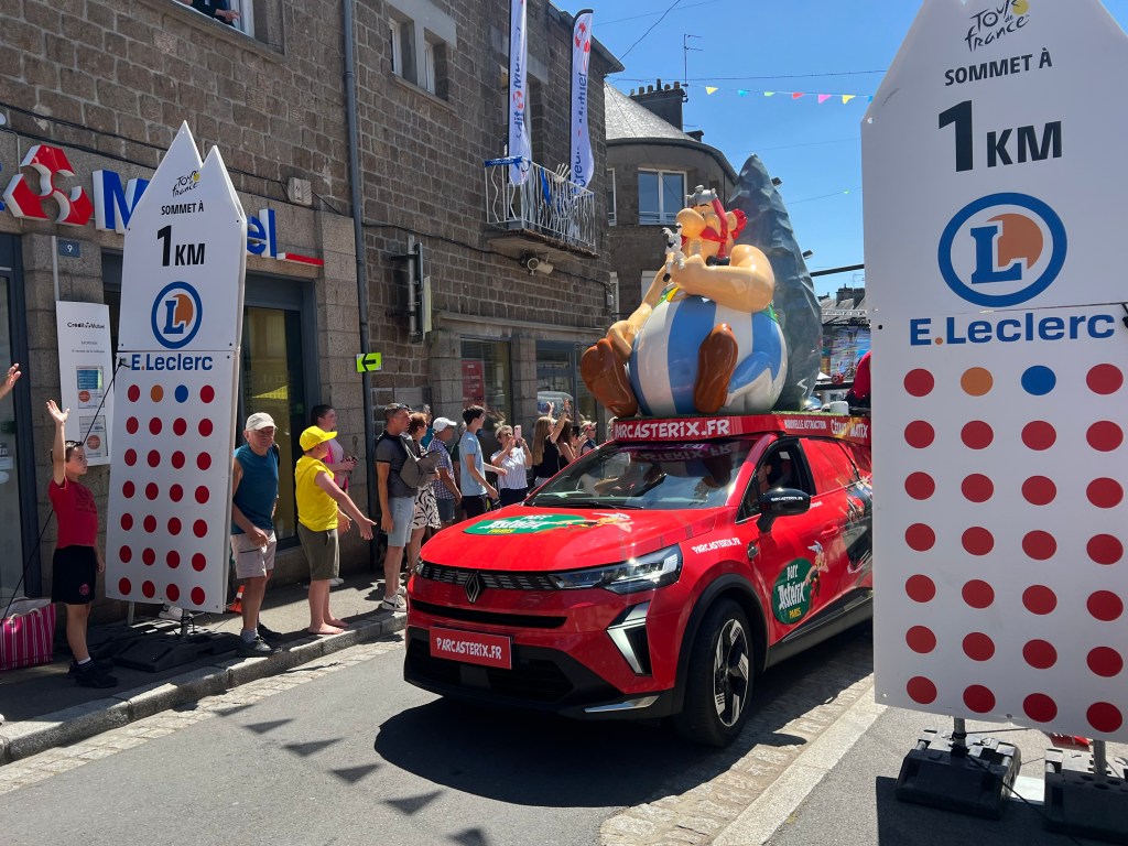 As it was we were just in time to see the caravan go through. Ahead of the Tour, this panoply of sponsors vehicles passes along the route, throwing hats, chicken costumes and samples of pasta and mayonnaise into the enthusiastic crowd, who squabble for each morsel like hungry piranhas savaging a steak. People jostle for the best position and guard their patch against all comers. Of course, it’s all for the kids; but there’s nothing quite like being the first to grab a yellow cap or snatching an Orangina from the hand of a passing lady aboard a bottle-shaped van. When the sponsors come calling, nobody is above scrabbling in the dirt for a complimentary novelty neck cushion.