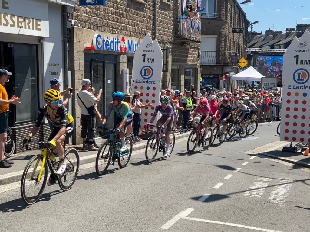 After the caravan, all was calm. We went to grab a hot dog and a beer and took our place in the shade once more. Then the five minute warning of the Tour’s arrival; we retook our places on the ramp, and listened as the riders were roared up the hill into town. It’s a climb we did before on our first day of riding in France, short and sharp, and the riders sped up it. First the breakaway, led by Simon Yates, and a couple of minutes afterwards the rest of the peloton. It was magnificent, brief, and incredibly exciting.