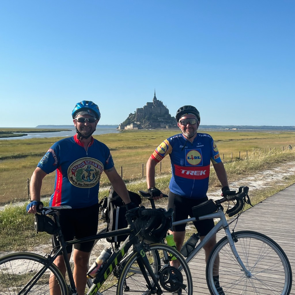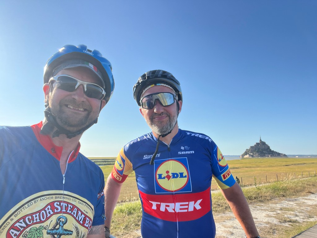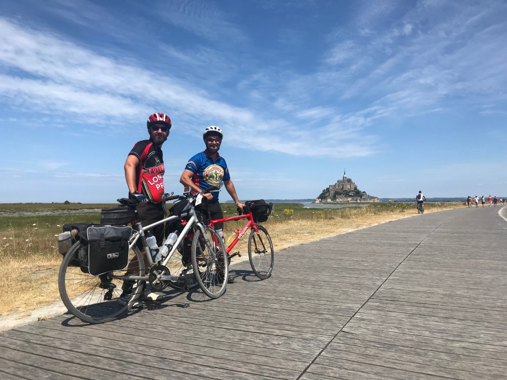 First we followed the voie verte, broadly downhill, all the way down to Ducey-les-Chéris. The gravel surface took a little effort, but we made good time and after hitting my 150km for the day (and Graeme’s 100) we decided a beer was in order. The first pint was tart, but in my stumbling French I explained the problem and got a fresh one from a new keg. Result. And then on to the coast, the sun getting low in the sky, the light on the bay of Mont St Michel soft and beautiful. As my legs flagged, Graeme hit the front and dragged me along for a few kilometre like the hero he is. Seven years ago, we stopped here and had a great photo taken on the boardwalk, and we recreated the photo as we passed. Sadly, for the second time that day, our choice of photographer was poor, but the selfie we took instead came close to the original. I was even wearing the same jersey: