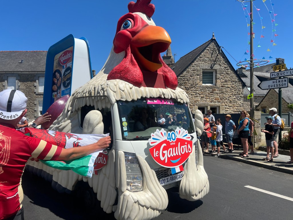 Back on the bikes, we whizzed through more lovely Breton countryside. There was less sightseeing now though; we were well and truly racing the Tour! We were hoping to arrive at Saint-Carreuc before the caravan arrived and we just about made it; it was due at 14:07, and we arrived two minutes early, with just enough time to scamper across the road before the sponsors’ cars came through. We weren’t as successful today, as just in front of us a tall, athletic young man scooped up most of the offerings, and those that made it to the floor were scavenged by the kids before my ancient back could even consider bending. Well, you win some, you lose some.