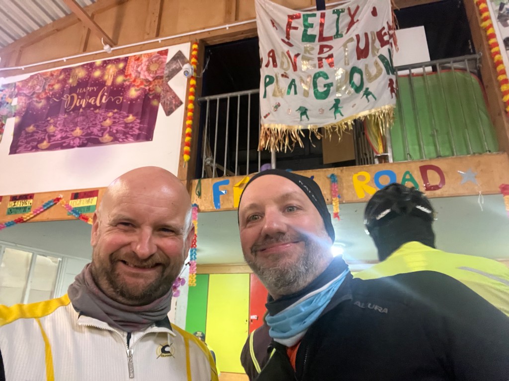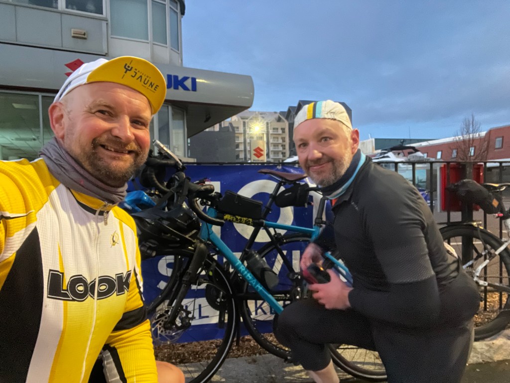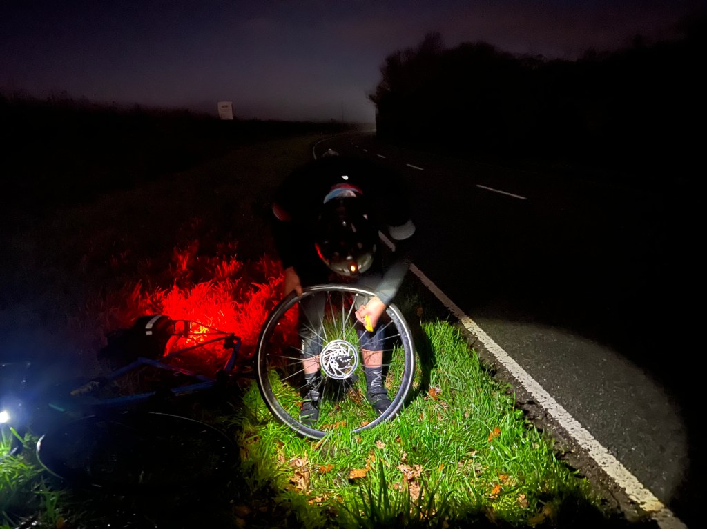 And then we approached two other riders who were fixing a puncture by the roadside and, as we gave them the customary offer of help, Graeme hit a pothole. We found it later that it was the same one that one of the other riders had hit and punctured both tyres on. Graeme shouted that he had punctured and we pulled onto the grass verge to replace the tyre. This took a while – the Schwalbe tyre was really tight and we couldn’t get it off as much as we struggled. Minutes passed without progress and suddenly I felt isolated. We felt a long way from anywhere, unable to continue but unable to resolve the issue, and I was glad there were two of us there working together. Starting to get cold, I flagged down a small group and before we knew it we had an extra eight eyes – and, critically, 32 more fingers – to help. Everyone had a go and eventually a guy with fingers like steel persuaded the tyre off so we could replace the inner. I could have hugged him; they sped on, Graeme for the repair sorted, and we were on our way again.