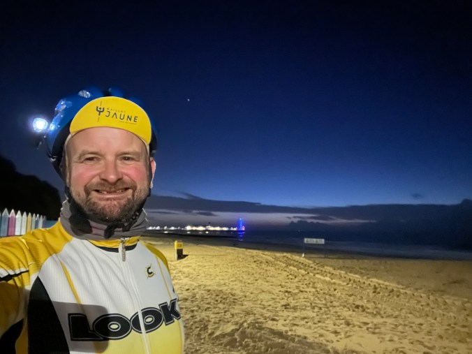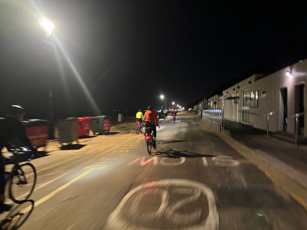There are few people around. We are greeted enthusiastically with bright ‘good morning’s by a small group of giggly teenagers who have probably been hanging around the beach all night, and make our way past occasional yawning dog-walkers, but the undercliff promenade mostly belongs to cyclists. Looking ahead you can see the occasional distant rear light bobbing along, and white lights to our rear, and we can spot our own kind as clearly as a glow-worm can. When we hit the sea front at Boscombe there were eight or ten of us in our little group; others dropped away as they stopped for a rest or to enjoy the scene until by the end of the promenade only Graeme and I were left together.