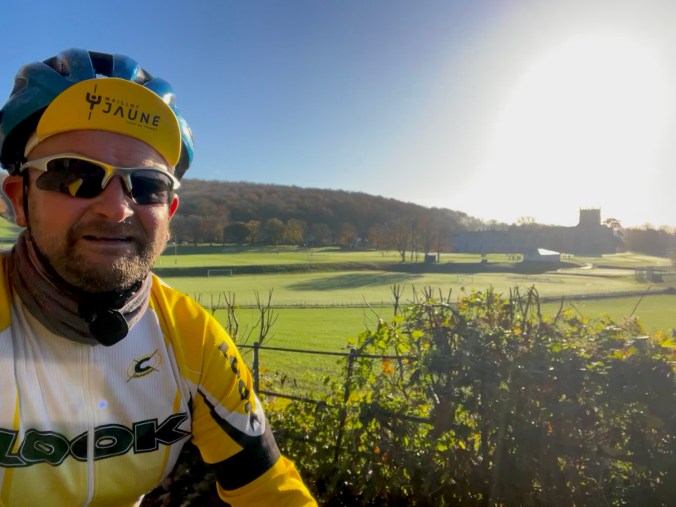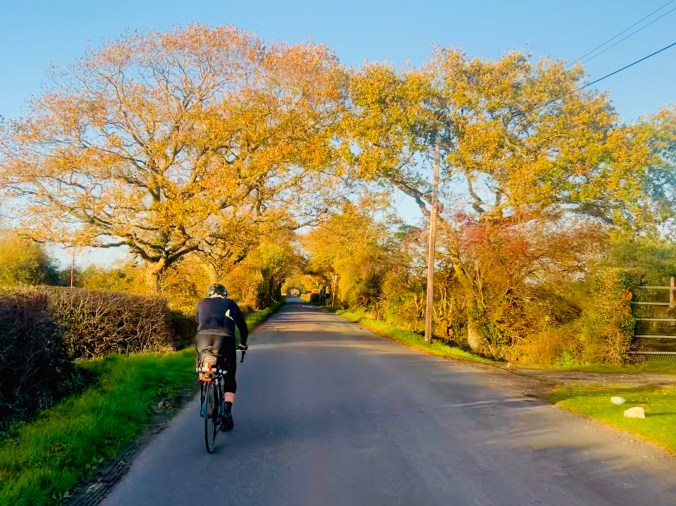 I’d never had a jacket potato for breakfast before but what a great idea. Topped with beans and accompanied by sausages and tea, with toast and marmalade for dessert, we were soon energised and ready to go again. The route swept north and upward through all the glorious shades of red and yellow that you’d associate with a Dorset autumn. It’s a wonderful part of the country for cycling and the route chosen popped with vibrant colour in the early morning light, a real contrast to the monochromatic grey of the hours before. The climbs rolled and were never hard, reaching the crest at the well-named View Coffee Shop at Milton Abbas – officially an optional stop but worth it for the friendly welcome and amazing views back down towards Purbeck and Poole. We carried on along a wonderful route through Sherborne, where we stopped to raise a hip flask to our longest ride ever (212km at that point), our double century, 12 hours on the bike and less than 100km to go. One more ridge and we were over onto the levels. We had to get a receipt to show we had been to the services at Podimore and I’m slightly ashamed to say that a Burger King – although very much deserved! – won the day.