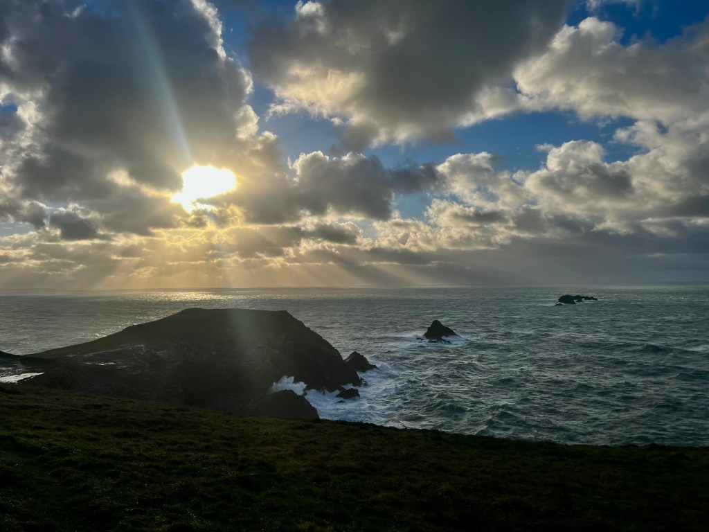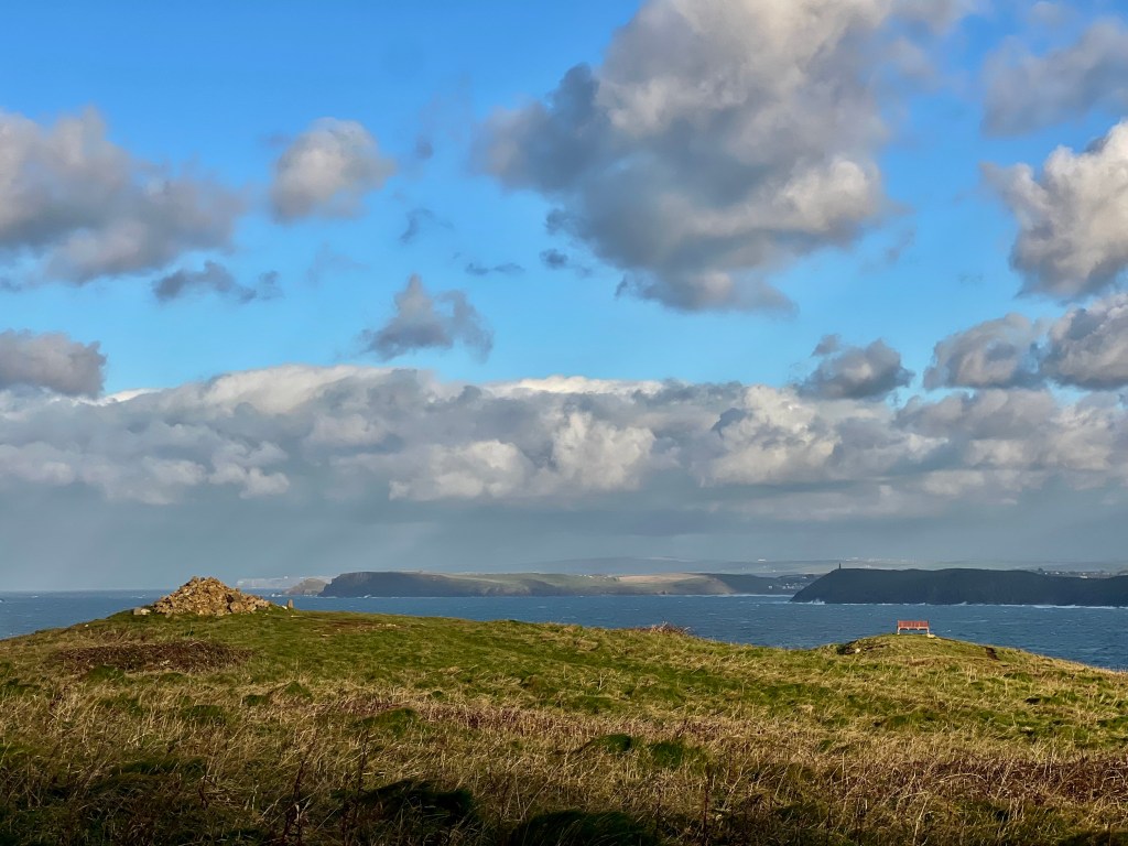 What a day it was. Trevose Head is the lump that sticks out from the north coast of Cornwall and on a clear day you can apparently see almost all of the north Cornwall coast. It is always exposed to whatever the prevailing weather might be and today we got the worst and the best of it, often simultaneously. We walked north from the hostel across Constantine Bay beach. Under the cloud it was darker than twilight, even as sunbeams lit up the distant ocean, and when the sun did come through it was like a summer’s day. Only the raging sea gave the game away. The wind cut through from the north and was strong enough to make us lean into it as we walked, while grains of sand whipped along the beach towards us.