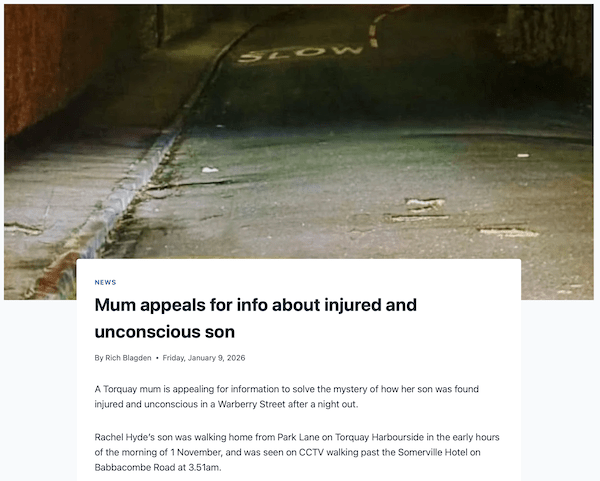 I met Rachel and her husband on a Friday night when they were out looking to find anyone who may have had news about what had happened to their son, who was found on the edge of a road after a night out. This was an article that required sensitivity and care to make sure the family’s plight was treated with appropriate respect.