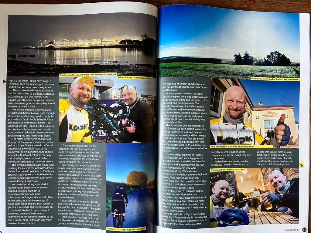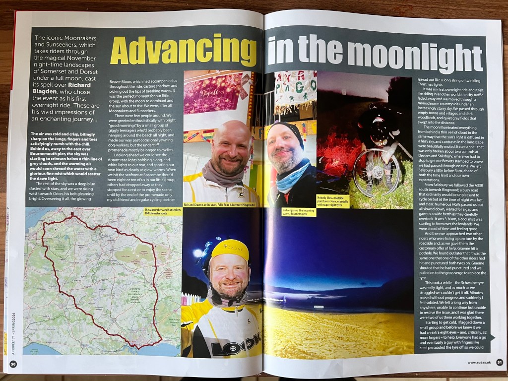 This was a really nice feature over four pages about an overnight Audax cycling event that I rode with my friend Graeme in November. The first version appeared here on this blog and I sent in an edited version to the Audax members’ magazine, Arrivée. It was published in their spring 2026 issue and I’m chuffed with how it came out!