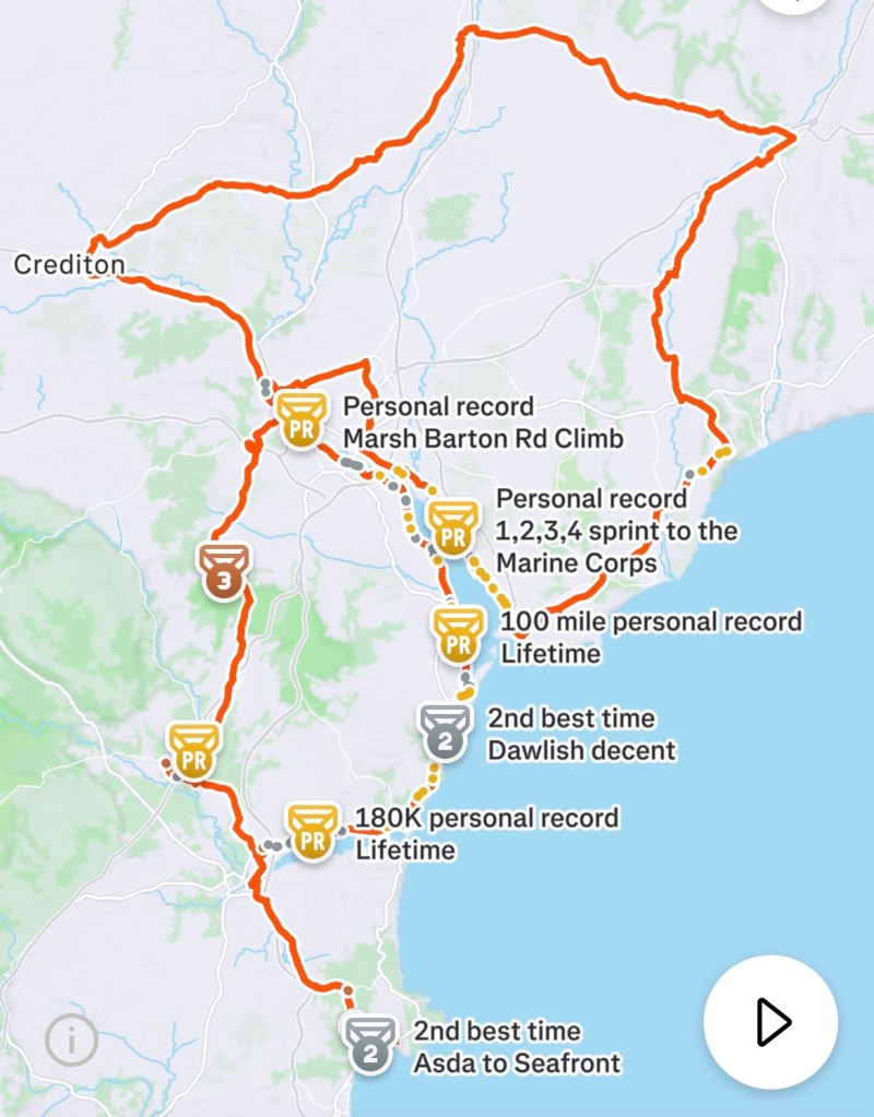 50 to go and all on familiar roads; first down the Exe and home via Dawlish and Teignmouth. On the Exe Estuary path I approached 165km and my mind raced with a weird monologue by an imaginary Frenchman berating the concept of the Imperial 100 (in miles not kilometres). He made me laugh and I’ll share his thought in another post. Holidaymakers were everywhere from Dawlish Warren onwards and I was close-passed, cut up, reversed into and turned left on more times that I can remember. The final straw was on Torquay seafront when a Landrover did a last-second pass on me and nearly knocked me off with his boot. I spent the last few kilometres in self-preservation mode and nearly missed the family, who had spotted me on the final stretch and jumped out of the car to wave me home.